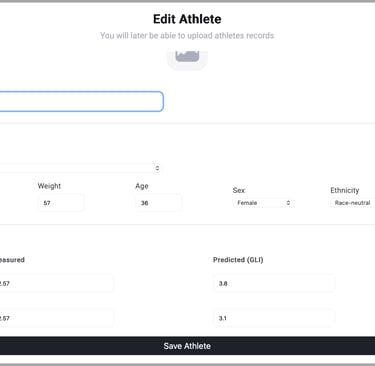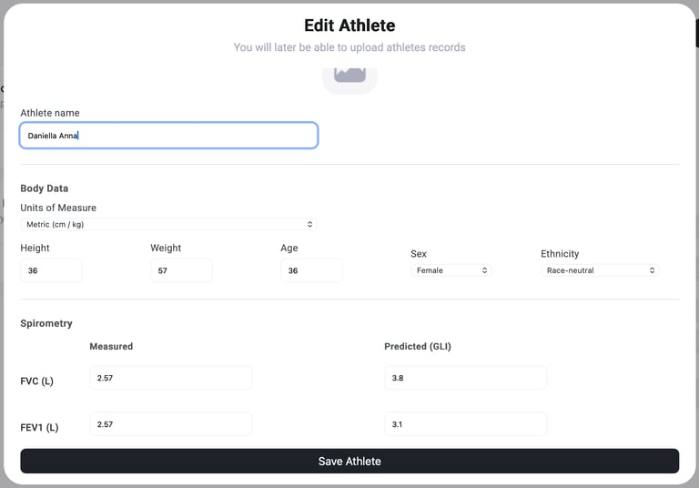 Keep all your athlete data organized and accessible. lets you create athlete folders with profile info for each person. In one place, you can store an athlete’s key details – including spirometry results (lung function) - All of that athlete’s past tests and charts live in their folder too, so you can quickly review history or compare performances without digging through files.