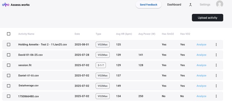 Assigning activity type keeps your assessments organized by type for easy comparison. You can tag each activity (e.g. VO2 max test, lactate step test, etc.) so that similar tests are grouped together. This makes it simple to compare like-for-like over time and see how an athlete progresses under the same conditions.Write your text here...