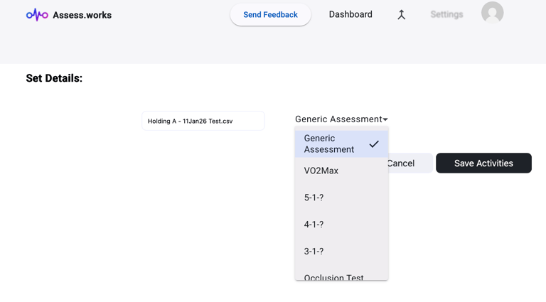 When you import a file, Assess.Works automatically creates activity entries based on the content. The platform reads your test data and breaks it into the right segments for you. This means no more manual setup – your sessions are ready to analyze as soon as you upload.