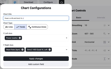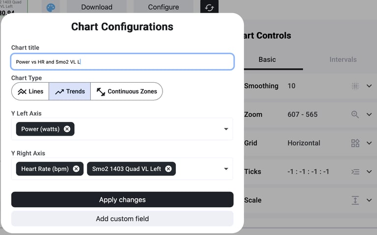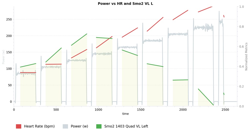 Trendlines and intervals are designed to work together seamlessly. Once intervals are set, the system calculates separate trend lines within each interval segment. In practice, this means you can see how each metric is trending during each work bout or rest. For example, you might find that in early intervals your heart rate climbs steadily, but in later intervals it plateaus – or that muscle oxygen (SmO2) trends downward faster as fatigue sets in. By breaking the data into interval segments, you isolate different physiological reactions. It becomes much easier to pinpoint when a change happened and under what conditions, instead of trying to interpret a single long continuous line.